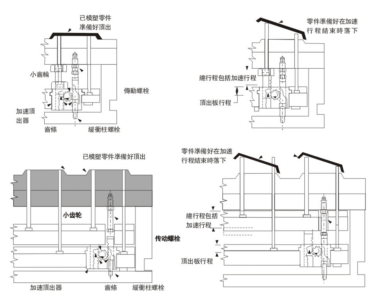加速頂出器使用一個齒條一小齒輪結構, 以提供多達5/8英寸的額外頂針行程。它們簡單的直綫移動可以用來增加頂針、頂針司筒或整個頂出器組件的速度和行程。 這些裝置上的法蘭和圓角, 使之安裝在頂出器組件裏非常容易 。 穿過齒條部分的長方形可以防止其旋轉。 每個裝置還包括有一個緩沖柱螺栓。 該螺栓保證齒條在頂出器組件完全返回時也能肯定地返回。