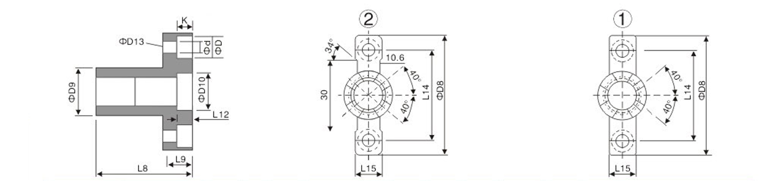 | Type | 型號 (+DKL62) | 尺寸 | D8 | D9 | D10 | L8 | L9 | L12 | L14 | L15 | R1 | ¢D13 | |||