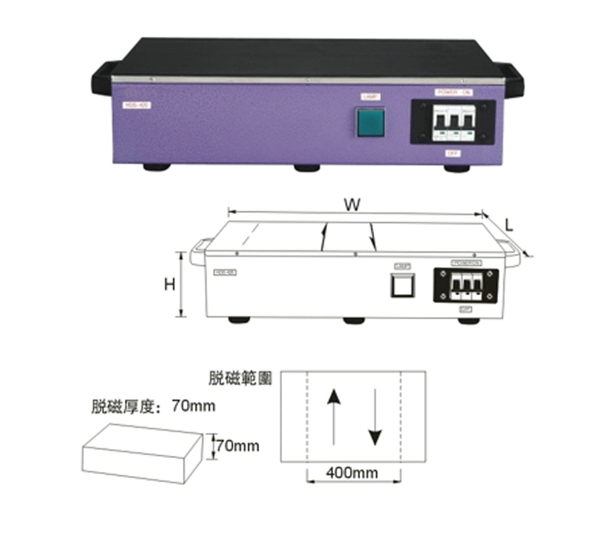 •  脫磁有效範圍400mm(16”),脫磁工件有效厚度70mm