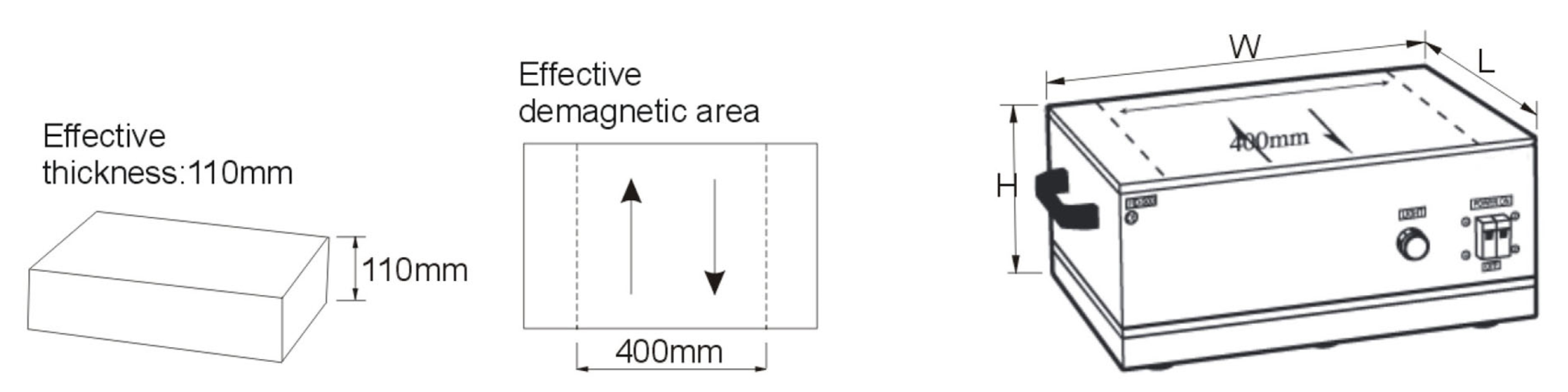 •  脫磁有效範圍400mm(16”),脫磁工件有效厚度110mm