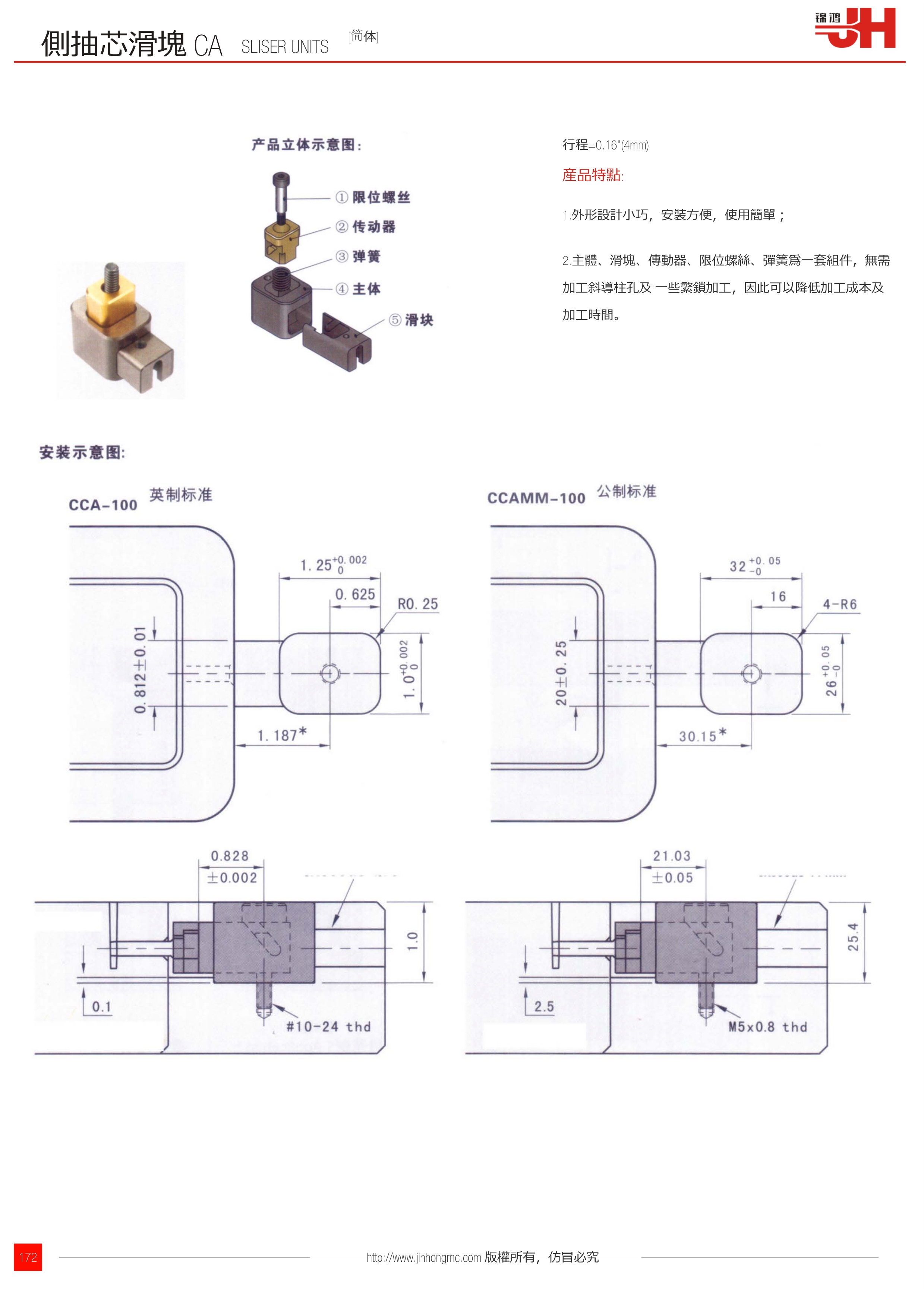 2.主體、滑塊、傳動器、限位螺絲、彈簧為一套組件,無需加工斜導柱孔及 一些繁鎖加工,因此可以降低加工成本及加工時間。