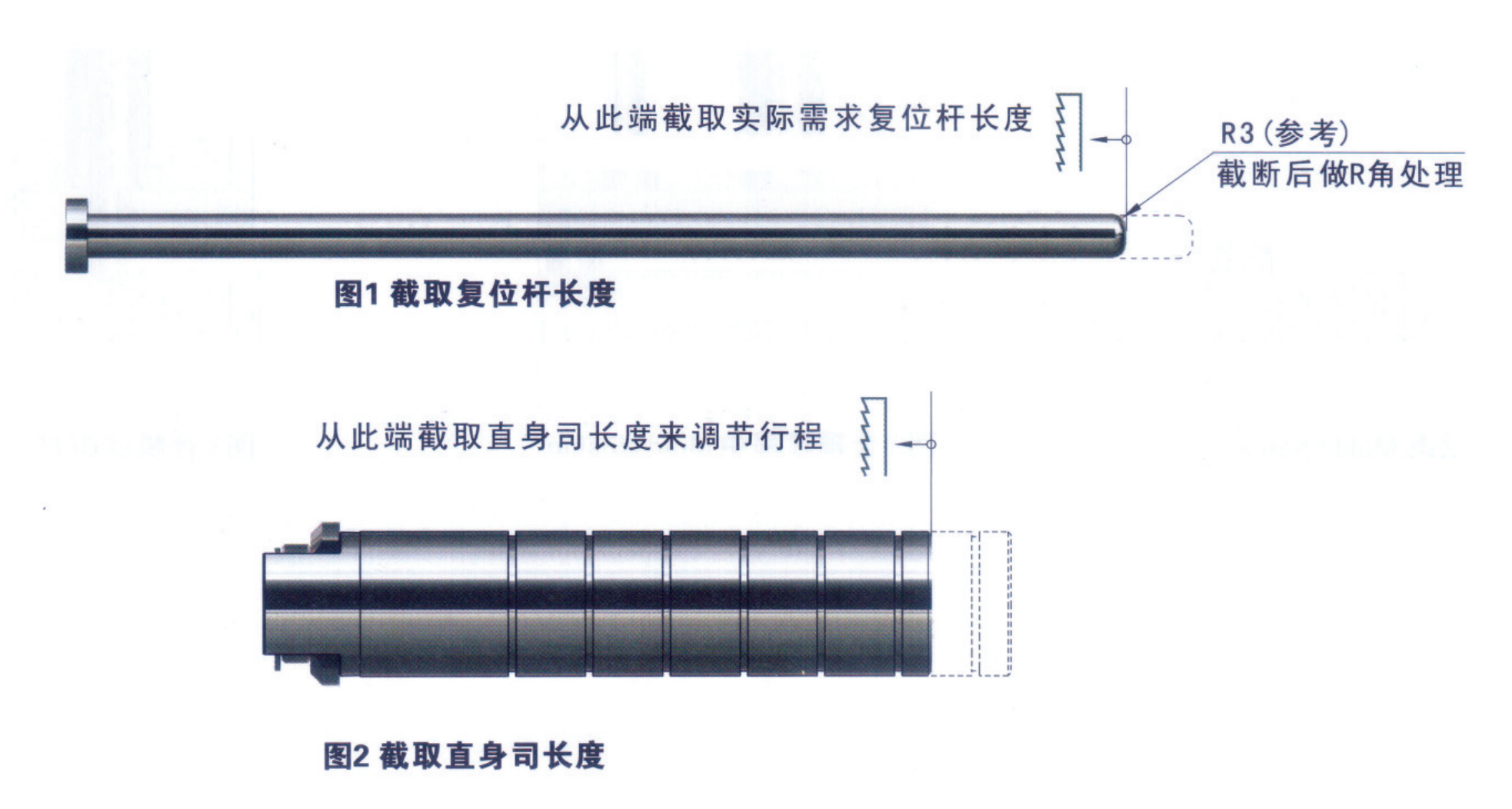 精確計算行程,可通過截取直身司及復位桿長度來調整復位行程(如下圖所示);