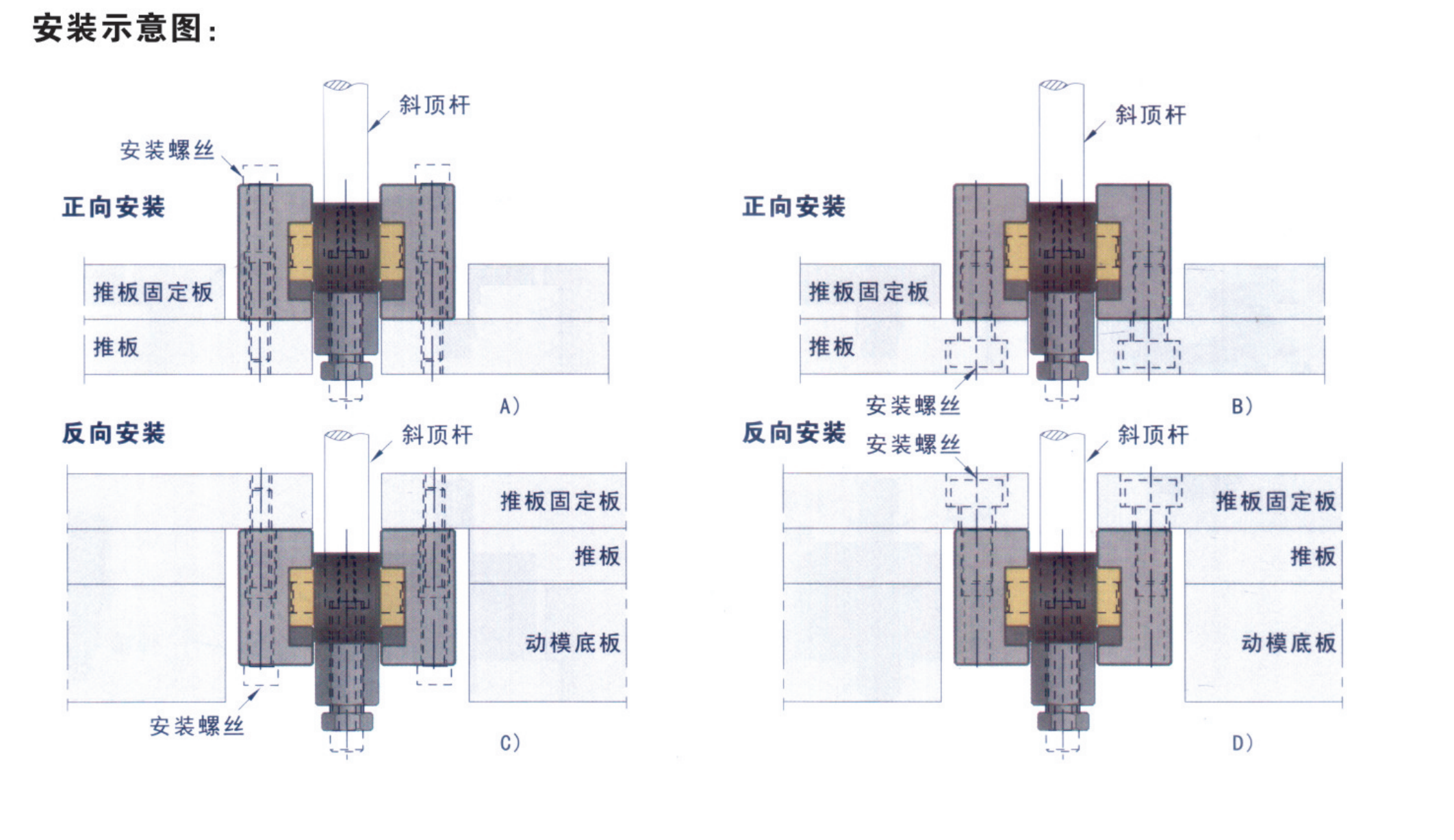 • 1.斜頂滑座有正、反兩種安裝方法,每種安裝方法分別有兩種不同螺絲固定方法,如上圖 A、B、C、D所示;