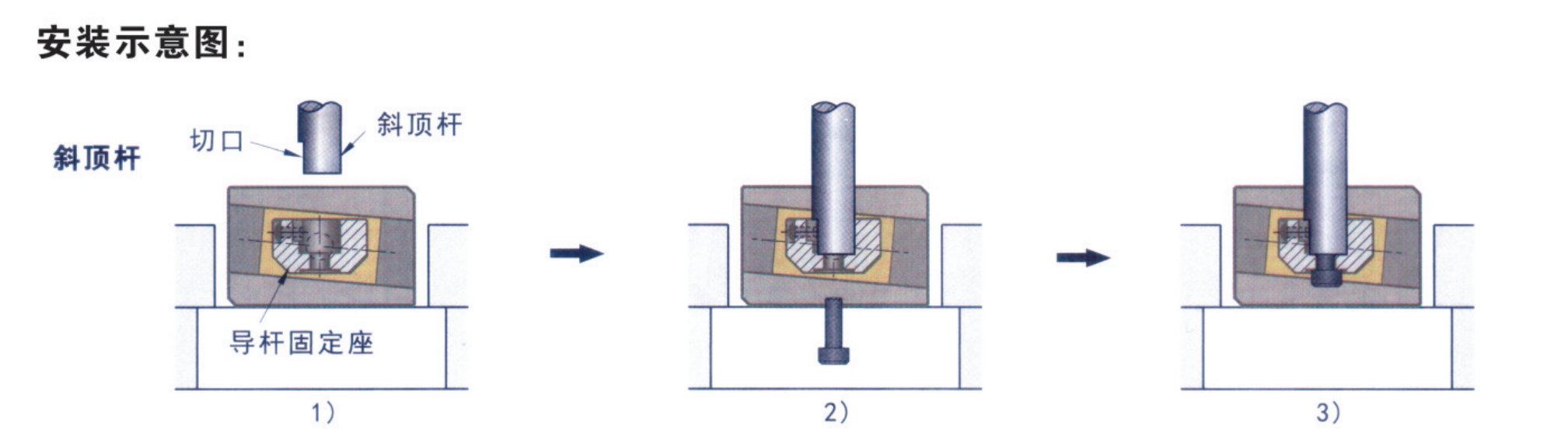 • 將斜頂桿插入導桿固定座并確保位置;