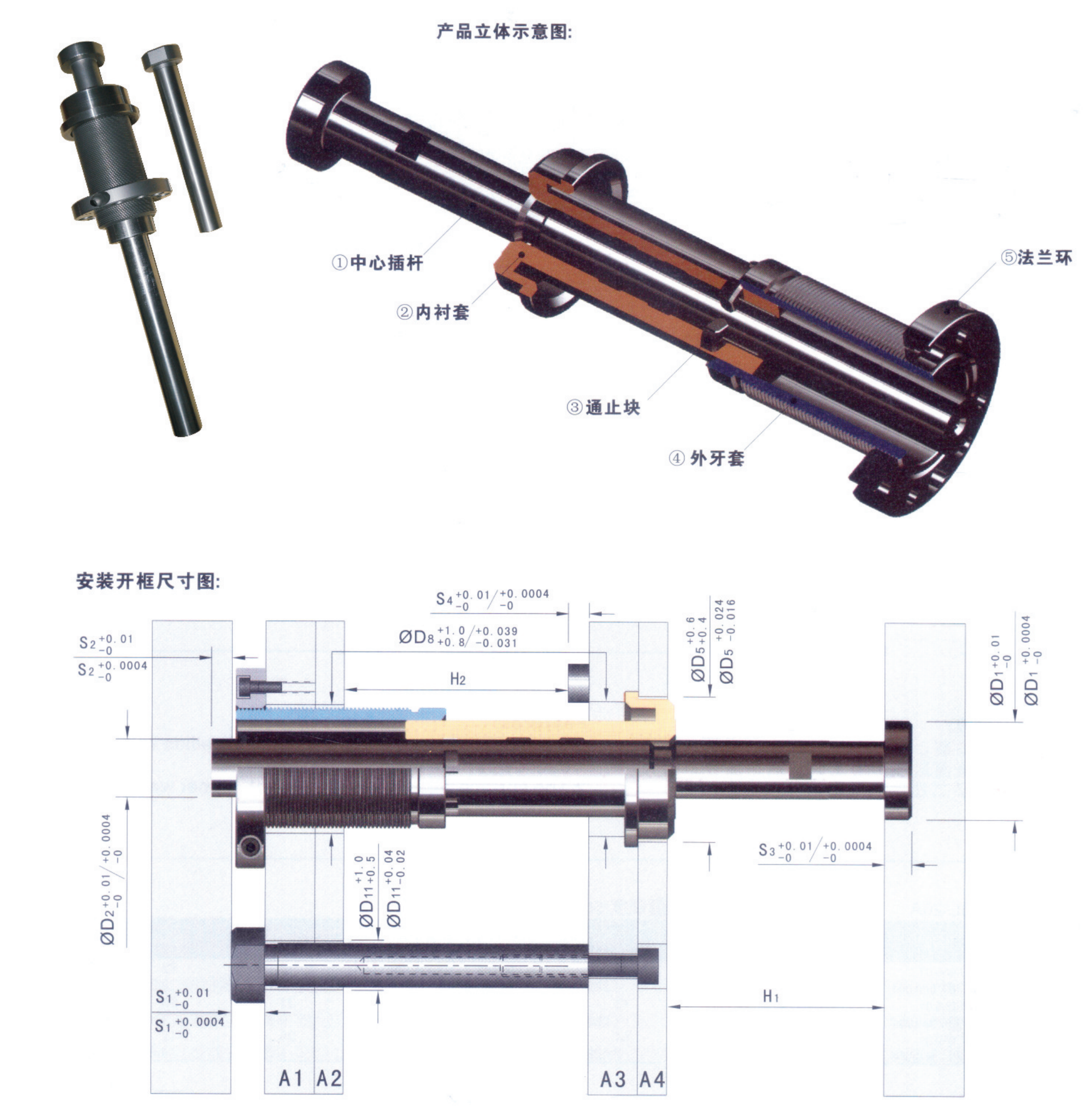 注意安裝前需計(jì)算精準(zhǔn),安裝完成后頂出行不可調(diào)節(jié),可在安裝前從中心插桿小徑 端截取長度來控制行程;